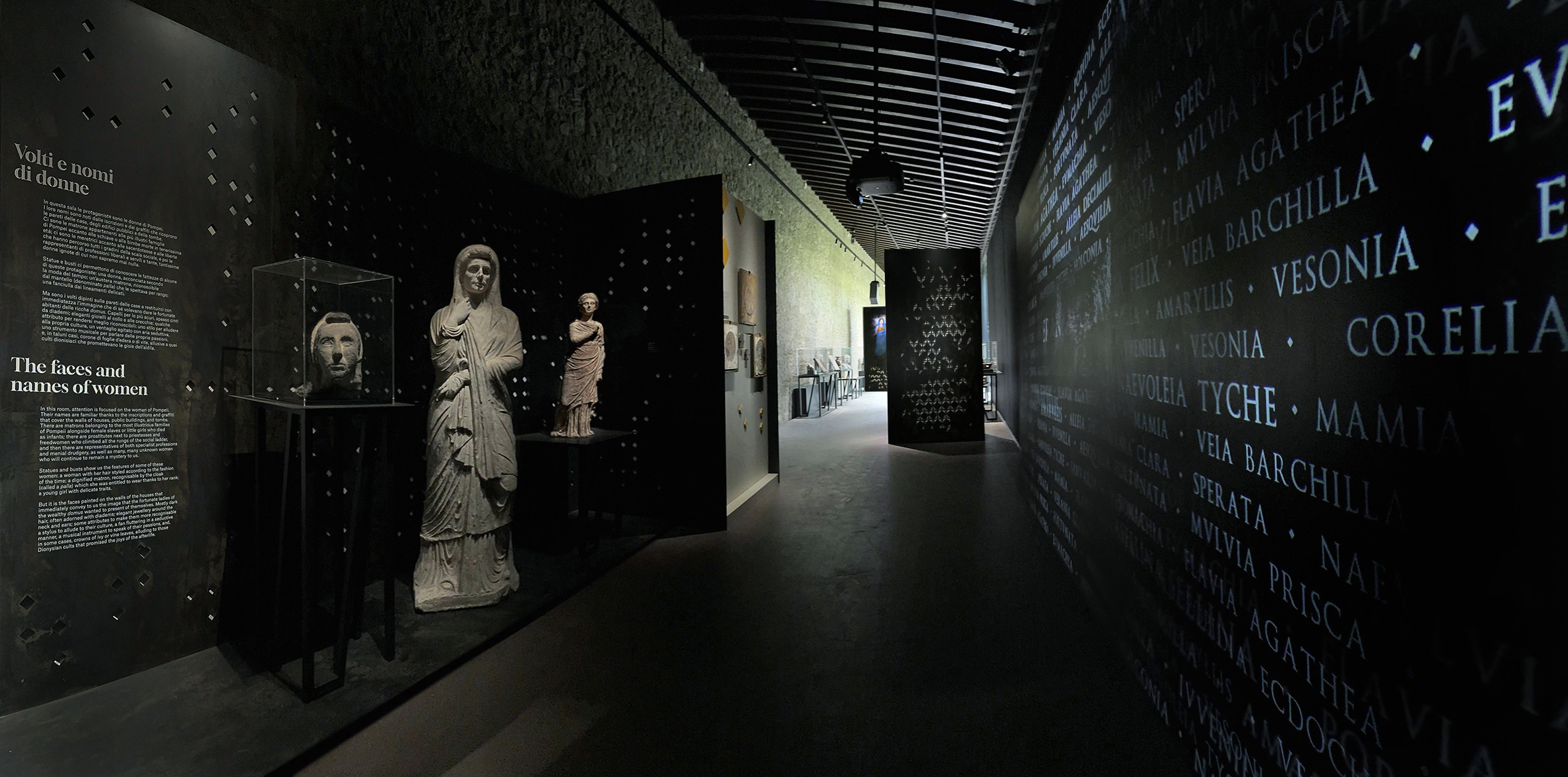 At the entrance, a series of female busts and statues welcome visitors as silent guardians of Pompeian women’s memory. Opposite these sculpted figures stands an immersive wall on which the names of Pompeian women—taken from graffiti and epitaphs—are projected in a continuous loop. This symbolic act restores their voices and identities, often lost to history. The interaction between the sculptures and the names creates a powerful emotional bridge between the ancient and the contemporary.