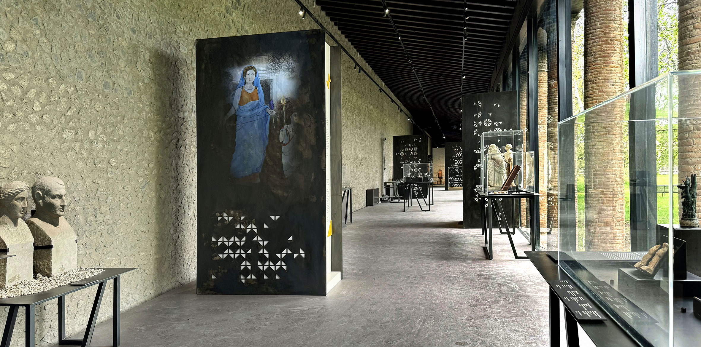 The exhibition takes place in the western portico of the Palestra Grande (1st century BCE), located in the Archaeological Park of Pompeii (Regio II). This majestic structure, with its clean architectural layout, is notable for the harmony of its proportions. The portico, with its regularly spaced columns, encloses a large garden with a pool where, in antiquity, young male members of the aristocracy trained in physical and athletic exercises as part of their cultural and military education. In 2019, this section of the portico was enclosed with a modern steel and glass structure, designed according to museum standards, making it suitable for hosting temporary exhibitions. This intervention, blending tradition and modernity, is seamlessly integrated into the prestigious archaeological setting.