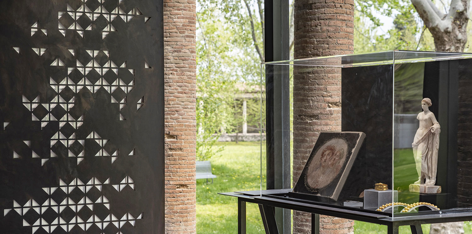 The exhibition unfolds through themed sections defined by three-meter-high rectangular metal frames, which structure the exhibition path. Designed to hold texts, graphics, and frescoes, these structures feature a distinctive “double skin”: an ivory-colored inner surface contrasts with the outer layer of black metal, decorated with geometric patterns inspired by Pompeian mosaics, created through an excision process. The cut-out motifs, which grow denser toward the center and fade out toward the edges, symbolize the passage of time and create a striking visual effect. This interplay of light and shadow enhances the visitor’s experience with a rich and immersive atmosphere. As the excised patterns interact with both natural and artificial lighting, the ambiance of the space continually shifts, creating a dynamic and engaging environment.